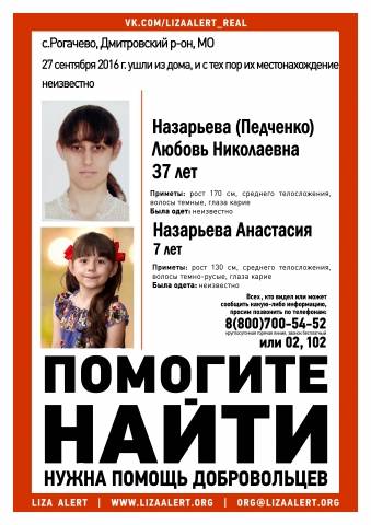 27 сентября 2016 года женщина и девочка ушли из дома в селе Рогачево Дмитровского района Московской области и до настоящего времени об их местонахождении ничего неизвестно.