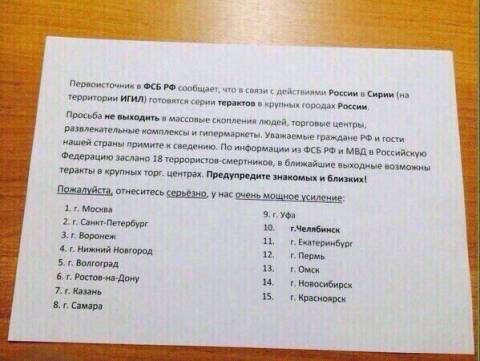 В сообщениях граждан просят не посещать в ближайшее время мест массового скопления людей: торговые центры, развлекательные комплексы и другое. Авторы этого оповещения ссылаются на полицию и ФСБ.