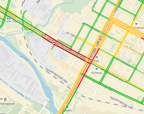 По данным сервиса «Яндекс.Пробки», скорость движения на Демидовской Плотине (в сторону Пролетарского округа) не превышает 3 километров в час. Рядом с «Рио» - не больше 7 километров в час.