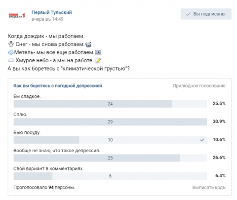В соцсети «Вконтакте» мы запустили голосование о том, кто и как борется с «погодной депрессией. Всего в голосовании приняли участие 94 человека. Как оказалось, большинство туляков испытывая депрессию, ложатся спать (таких – 29 человек, что составляет 30,9% от общего числа).