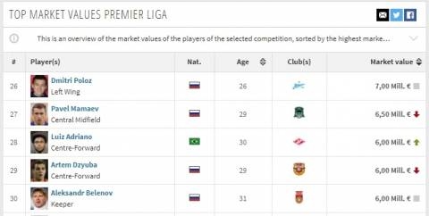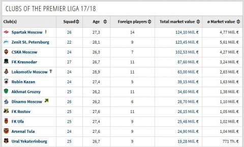 Самый авторитетный спортивный портал о стоимости футбольных игроков и клубов Transfermarkt опубликовал новые рейтинги ценности игроков и клубов, в том числе - рейтинг в рамках РФПЛ. По версии сайта, стоимость игроков "Арсенала" составляет 24.9 миллиона евро, и клуб занимает 11 строчку в рейтинге стоимости клубов. Перые три строчки ожидаемо занимают московские "Спартак" и ЦСКА и санкт-петербургский "Зенит".