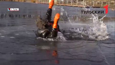 Поэтому тульские спасатели сейчас отрабатывают свои действия на пруду Центрального парка. Условия тренировок такие же, как в действительности: температура на поверхности – 0, в воде +3. Солнце бьет в глаза, видимость – на три шага вперед. Прорубь почти не заметна. Одно неловкое движение – и у человека есть только семь минут, чтобы выбраться из ледовой ловушки.Один из сотрудников МЧС имитирует пострадавшего, его коллеги действуют так же, как в чрезвычайной ситуации. Самый простой вариант: использовать специнвентарь. На вооружении у отряда - спасательный круг, трос и веревка с поплавками. Бросать спасательные средства нужно с максимального удаления. Затем -осторожно приблизиться к человеку в проруби. Как правило, лед бывает тонкий. Чтобы снизить нагрузку на поверхность, лучше ползти, лежа на пожарной лестнице или салазках. Как только утопающего освобождают из ледового плена, его волоком тащат на берег. Здесь сразу укутывают в плед, дают горячий чай и вызывают скорую помощь.