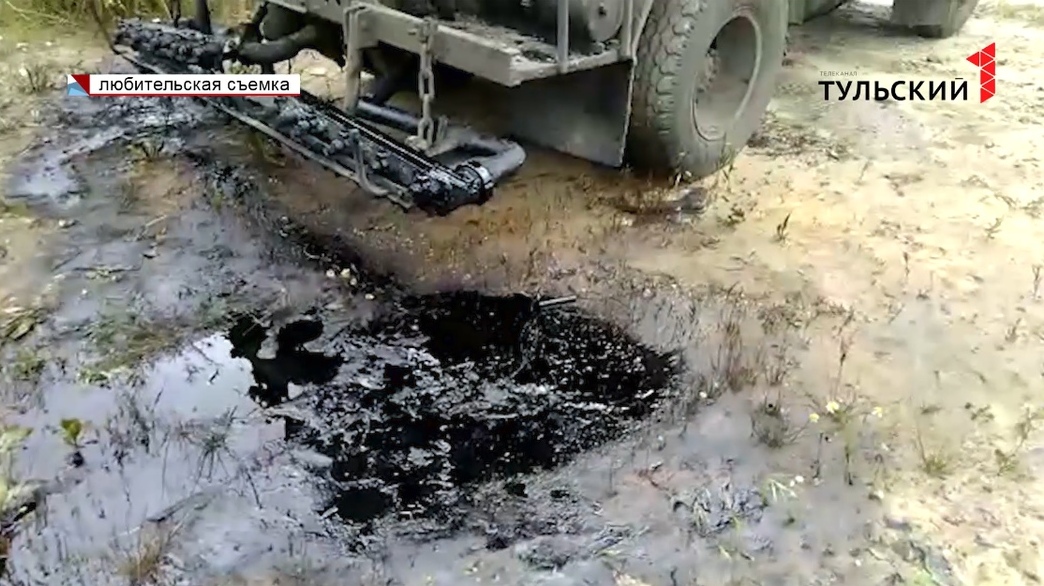 Это уникальные кадры. На них – машина одного из крупных предприятий Тульской области сливает битум прямо на землю. А при виде камеры, быстро удаляется. Время – 10-30 утра пятницы. Место действия – окраина Богородицка. Такими же нефтеотходами здесь загрязнено около полугектара земли. Есть свежие и уже подсохшие лужи. Черное вещество глубиной кое-где - до 5-7 сантиметров. Предположительно, это битум. Точно установит экспертиза - ее инициировала прокуратура Тульской области.