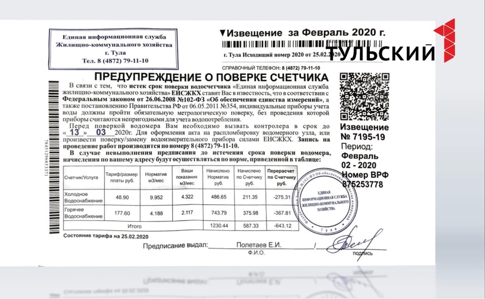 В ходе журналистского расследования выяснилось, что лицензия для поверки счетчиков у них есть, но это могут сделать и сами жители, причем бесплатно. Перед этим они должны вызвать сотрудников «Тулагорводоканала», чтобы снять показания со старого прибора и опломбировать новый. Иначе придется заплатить кругленькую сумму с четырьмя, а то и с пятью нулями.