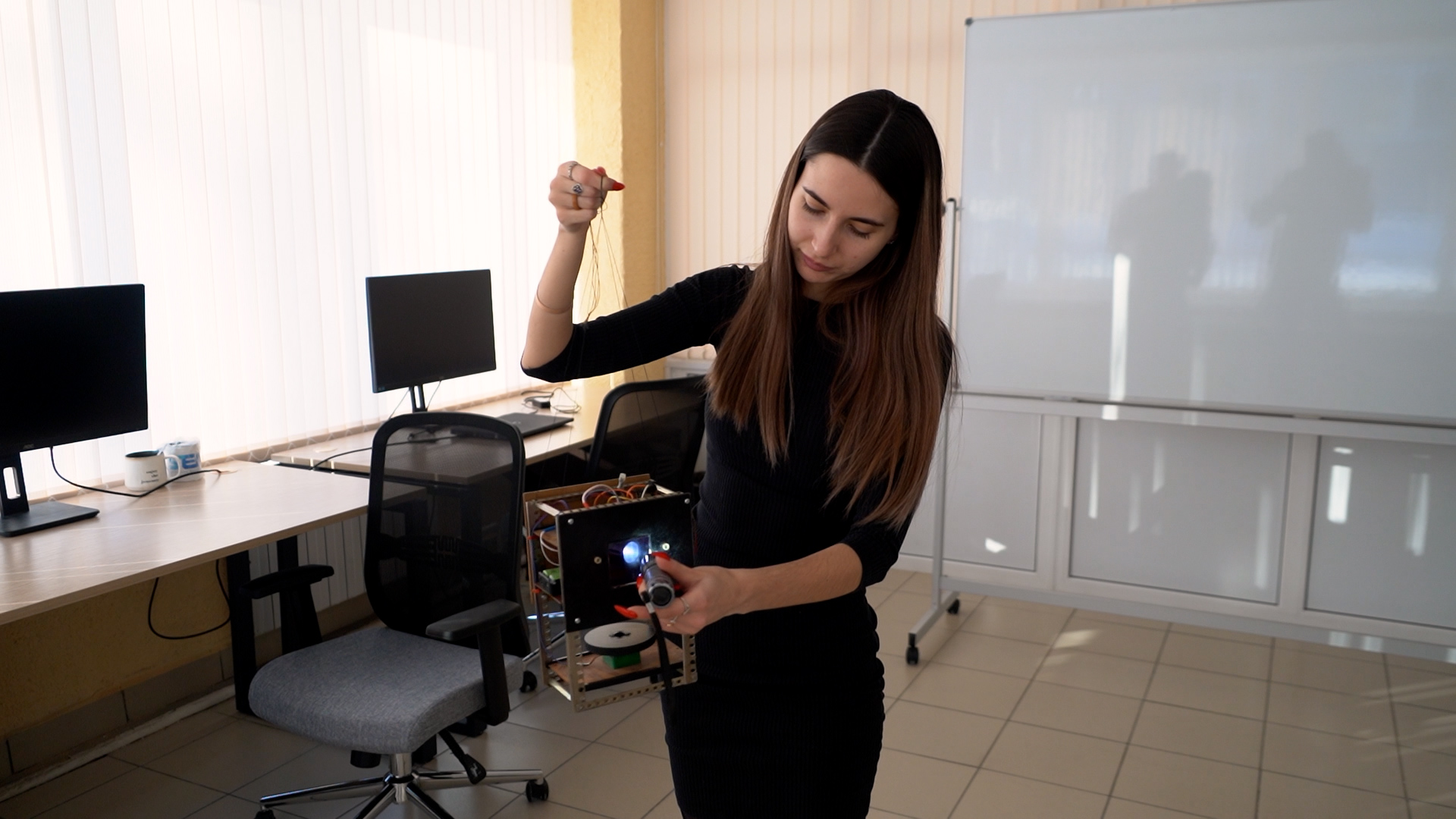 Эта хрупкая девушка перемещает предметы на расстоянии. Лучом обычного фонарика она приводит в движение аппарат весом в килограмм. Модель на подвесе вращается вслед за светом, который одновременно и ориентир, и источник энергии. Но магия и телекинез здесь не при чём. Так магистрант института высокоточных систем Тульского Госуниверситета Альбина Хомячкова испытывает собственную разработку – солнечные датчики ориентации и навигации, которые можно применять на орбите. Идею уже оценили на федеральном уровне – на её развитие одобрили грант в 500 тысяч рублей.