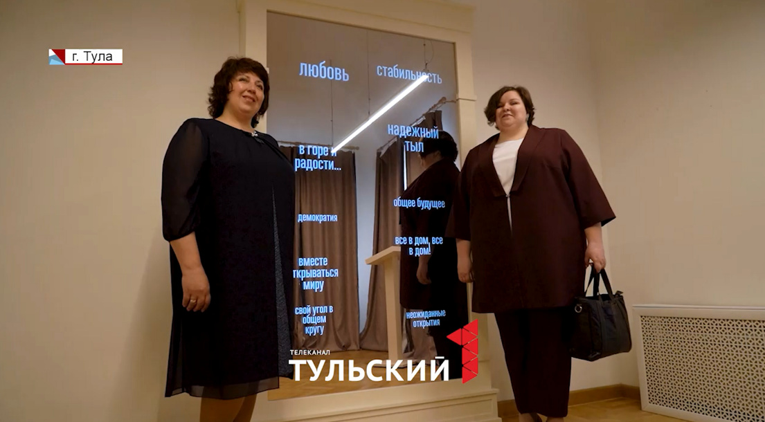 Это зеркало - интерактивный экспонат музея семейной истории. Каждый посетитель с помощью планшета может выбрать слова, описывающие модель своей семьи. И они появятся на зеркальной поверхности. Одно из ключевых понятий для Татьяны и Канкордии Тихоновых – «стабильность». Не случайно: 6 поколений их семьи – педагоги. Вот и Татьяна – директор школы и учитель математики, а Канкордия ведет уроки в младших классах в Киреевске. Общий рабочий трудовой стаж их семьи - 437 лет. Тихоновы - в списках лучших трудовых династий региона. Их ко Дню Весны и Труда чествуют в Туле.