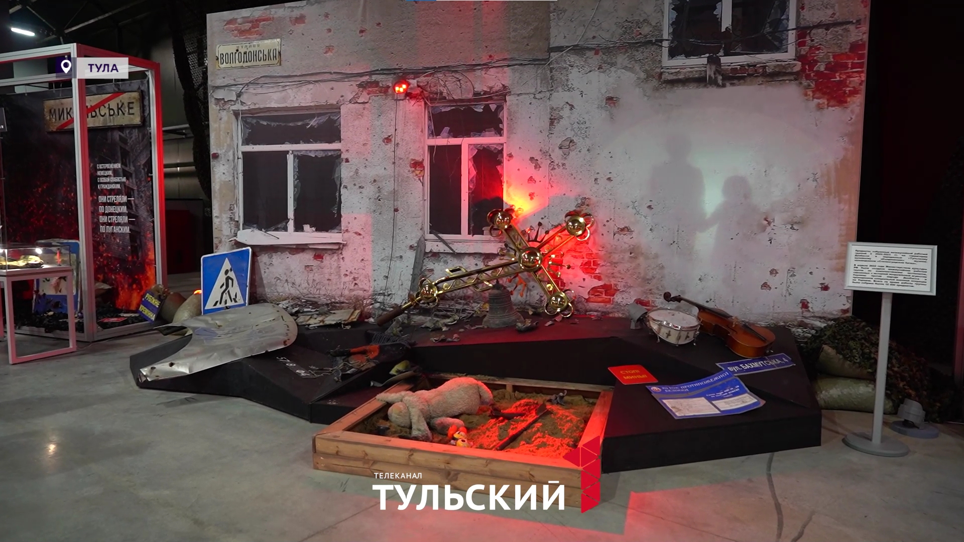 Возможно, этот плюшевый пес был чьей-то любимой игрушкой. И еще четыре года назад с ним в песочнице на Донбассе играли малыши. Там его и оставили, когда в спешке бежали в укрытие. Теперь потрепанная жизнью игрушка - экспонат новой выставки в тульском музее "Патриот". Здесь каждый предмет - немой свидетель боевых действий на Донбассе - может рассказать больше, чем любой экскурсовод. Как этот дорожный знак, капот автомобиля или золотой крест с церкви поселка Метёлкино. Его сбил украинский снаряд. А тульские бойцы подобрали и привезли в Тулу. Чтобы посетители экспозиции знали, за что наши ребята сражаются на передовой.