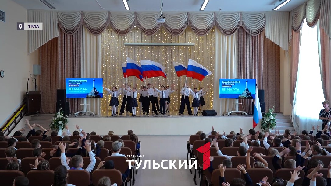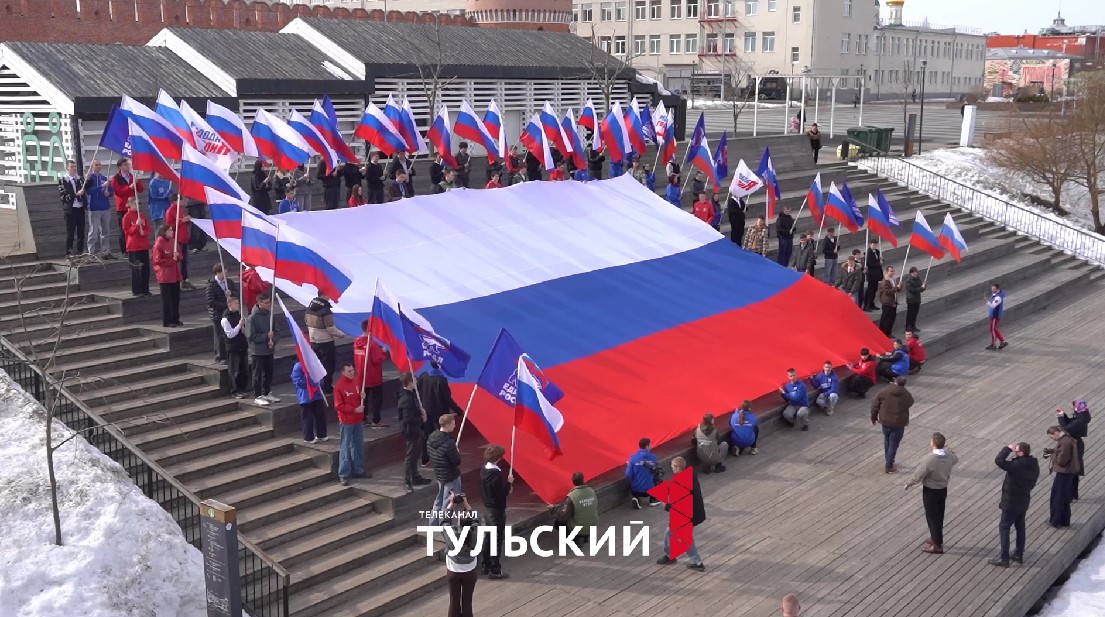 В длину этот гигантский триколор растянули на 15 метров.  И чтобы получилось красиво и ровно -  30 человек выполнили эту почетную миссию.  Поводом для флешмоба на Казанской набережной стала годовщина воссоединения Крыма и Севастополя с Россией. В состав федерации полуостров вошел по итогам референдума 18 марта 2014 года. Отпраздновать событие 12-летней давности у стен Кремля пришли тульские студенты, волонтеры и активисты молодежных организаций.