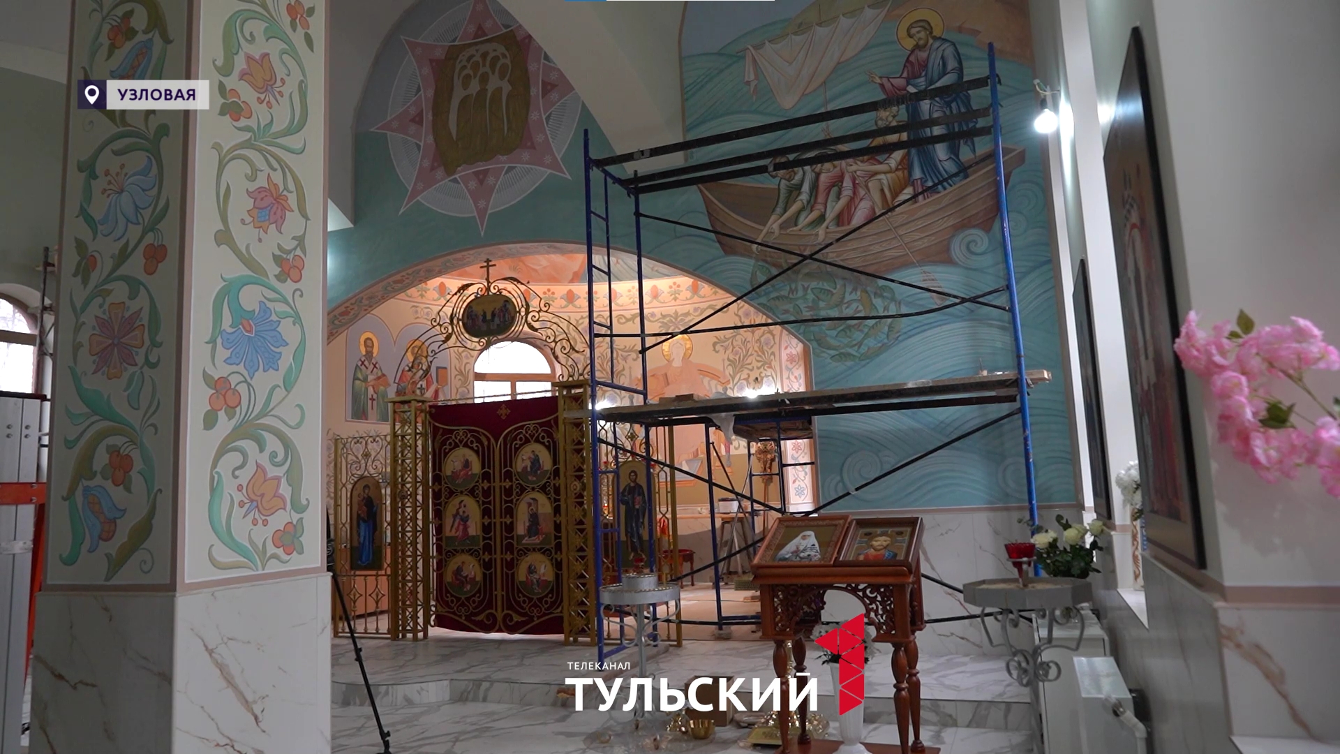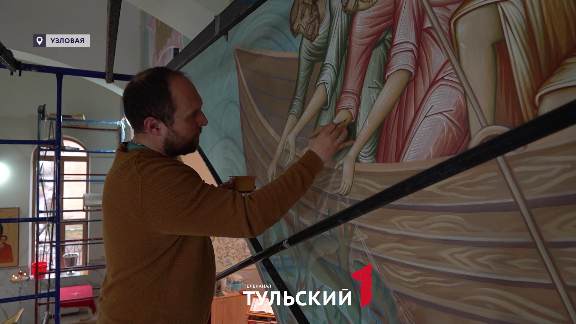 То, что сейчас делает стенописец, не укладывается в привычные законы искусства при оформлении храма. Если бы это был не храм, а, например, полотно, то блик живописец делал бы белым - это художественное правило, но в данном случае специалист делает его золотым. Смелый шаг. Ведь солнечный свет лучше всё-таки отражается от белого, а золото - не дает такого объема. Но визитная карточка мастеров из Палеха - именно блик золотой. Палехская роспись узнаваема: тонкая графика, насыщенные цвета и внимание к каждой линии. Методику применяли мастера в разных церквях по всей стране, например, в Москве, в храме 12 Апостолов. На этот раз специалисты работают в Узловой - в церковном комплексе святой Матроны.