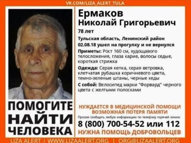 В редакцию «Первого Тульского» обратилась местная жительница. Она попросила помочь найти ее пропавшего отца – Ермакова Николая Григорьевича. В августе 2018 года он поехал кататься на велосипеде, заехал на берег Упы в Туле.