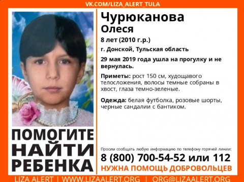 В городе Донской Тульской области пропала 8-летняя девочка - Олеся Чурюканова. 29 мая она ушла на прогулку и не вернулась.