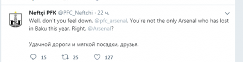 В Твиттер-аккаунте «Нефтчи» появилась запись – обращение к тульскому и лондонскому «Арсеналу». Бакинцы пишут: