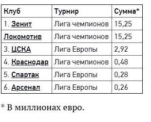 За участие в Лиге Европы тульский «Арсенал» получил 260 тысяч евро, оказавшись при этом на последнем месте среди других российских команд. Больше всех в турнире Лига чемпионов заработали «Зенит» и «Локомотив».