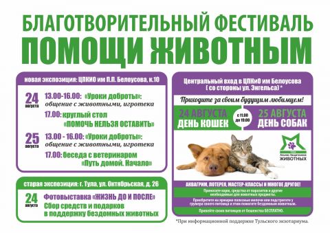 24 и 25 августа в Тульском экзотариуме пройдут уроки доброты. Мероприятие состоится в рамках Благотворительного фестиваля помощи животным.