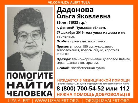 В Тульской области пропала 86-летняя женщина. 27 декабря в Донском Додонова Ольга Яковлевна ушла из дома и не вернулась.