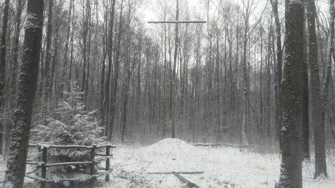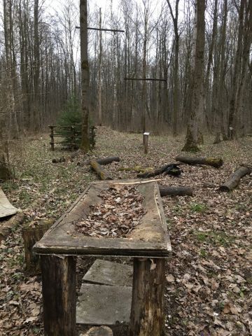 Фотографиями «своей находки» она поделилась в соцсетях. На фотоснимках видно, что на поляне посреди леса установлены два высоких креста, стол, кострище и зеркало, а также ель огороженная забором.