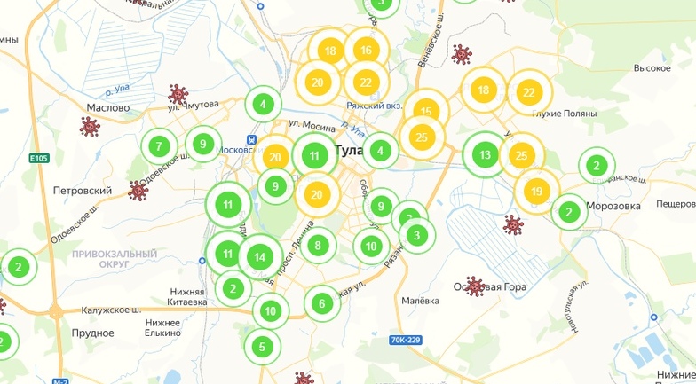 Правительство Тульской области предоставляет интерактивную карту с активными очагами инфекции. На ней отмечены дома и улицы, где находятся заболевшие коронавирусом, за исключением адресов тех, кто победил заболевание или скончался.