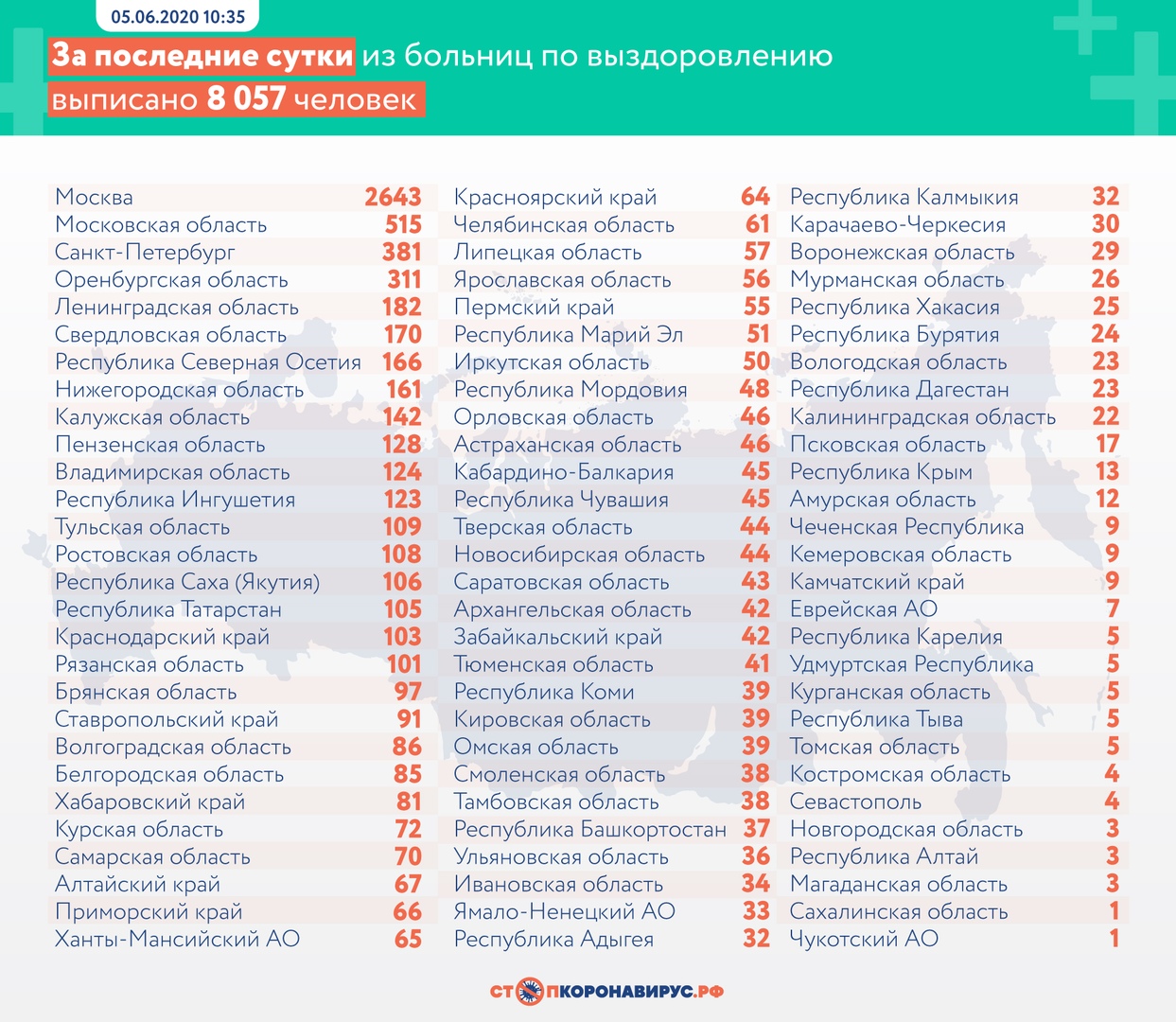 В России за последние сутки выписали 8 057 человек, всего же заболевание в нашей стране удалось победить 212 680 пациентам.