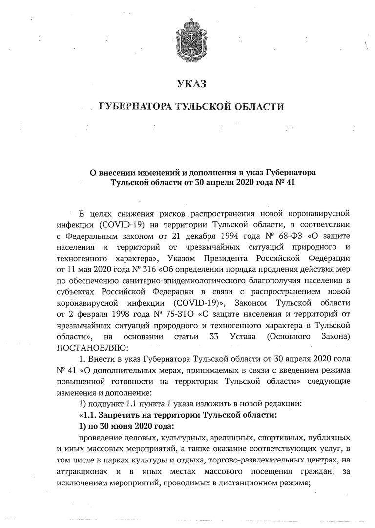 Сегодня, 15 июня, глава региона Алексей Дюмин подписал Указ о продлении ограничительных мер в связи с угрозой распространения коронавируса.