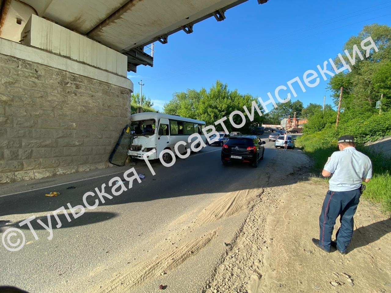 По предварительной информации, водитель автобуса, едущего по маршруту 162к, не справился с управлением  и врезался в опору моста. В аварии пострадали пассажиры. Сотрудники тульской Госавтоинспекции выясняют все детали происшествия и количество пострадавших, сообщает УГИБДД УМВД России по Тульской области.