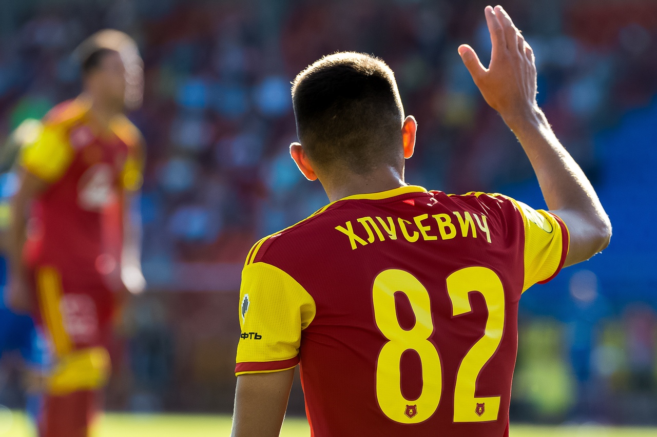 После подачи углового, которую выполнил Владислав Пантелеев, гол ударом головой забил 19-летний Даниил Хлусевич - 0:1.