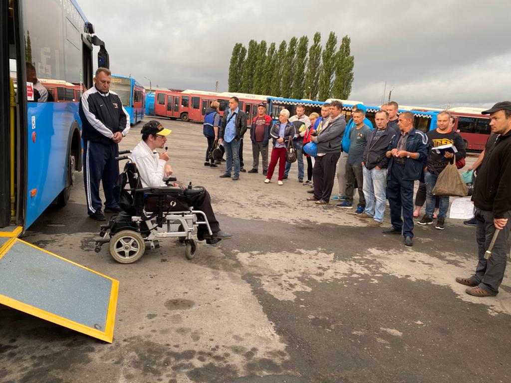 Главный инструктор-специалист сектора по координации работы с лицами, имеющими ограниченные возможности здоровья Артем Муницын наглядно показал как должен действовать водитель при посадке и высадке маломобильных пассажиров.