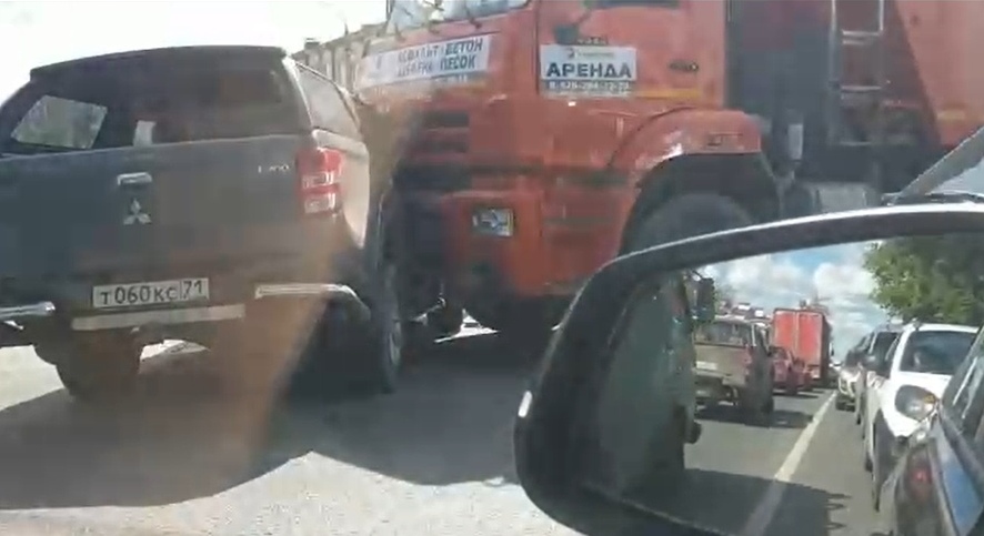 В Туле на улице Мосина КамАЗ подмял внедорожник. Грузовик и Mitsubishi L200  столкнулись на перекрестке с оживленным движением. Сообщение об этом и видеозапись с места происшествия очевидцы прислали в редакцию  "Первого Тульского" телеканала.