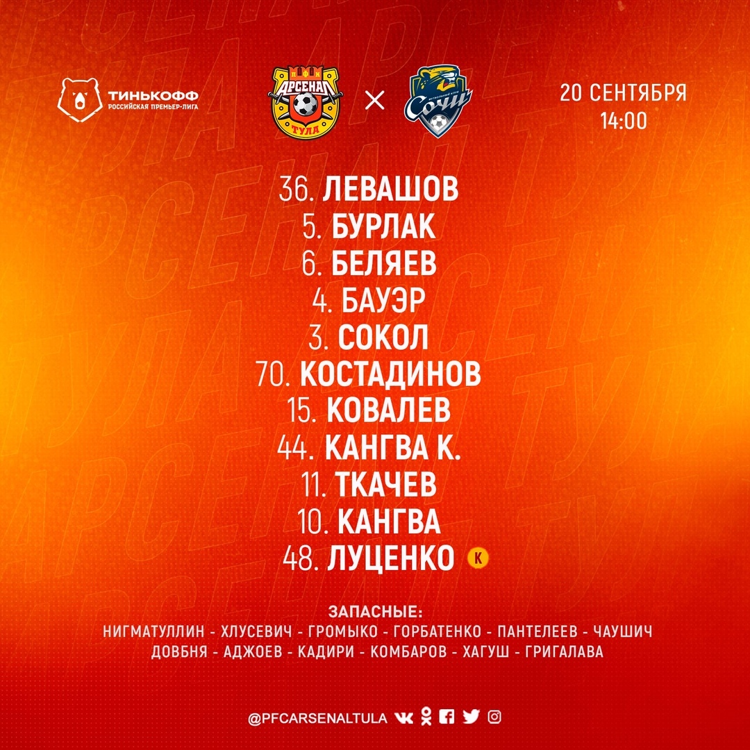 Сегодня, 20 сентября, тульский «Арсенал» сыграет с клубом «Сочи» на Центральном стадионе в Туле. Матч начнется в 14:00.