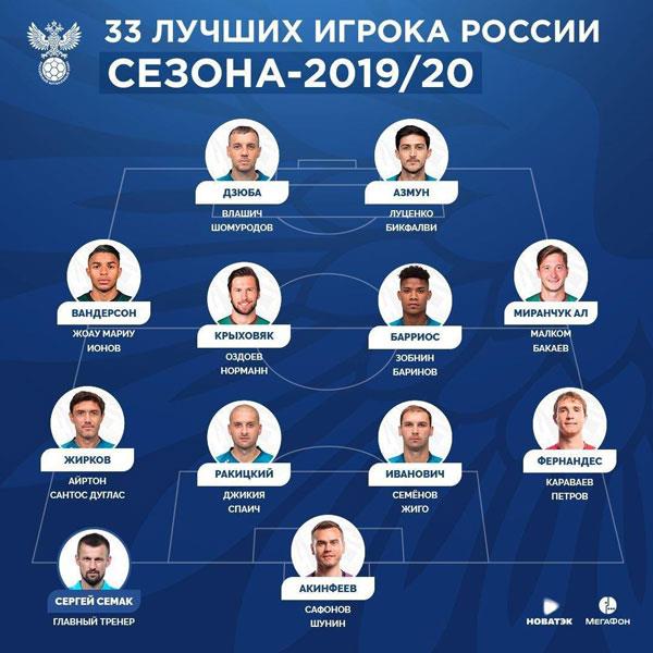 В исполкоме Российского футбольного союза составили список 33 лучших футболистов сезона 2019/2020.