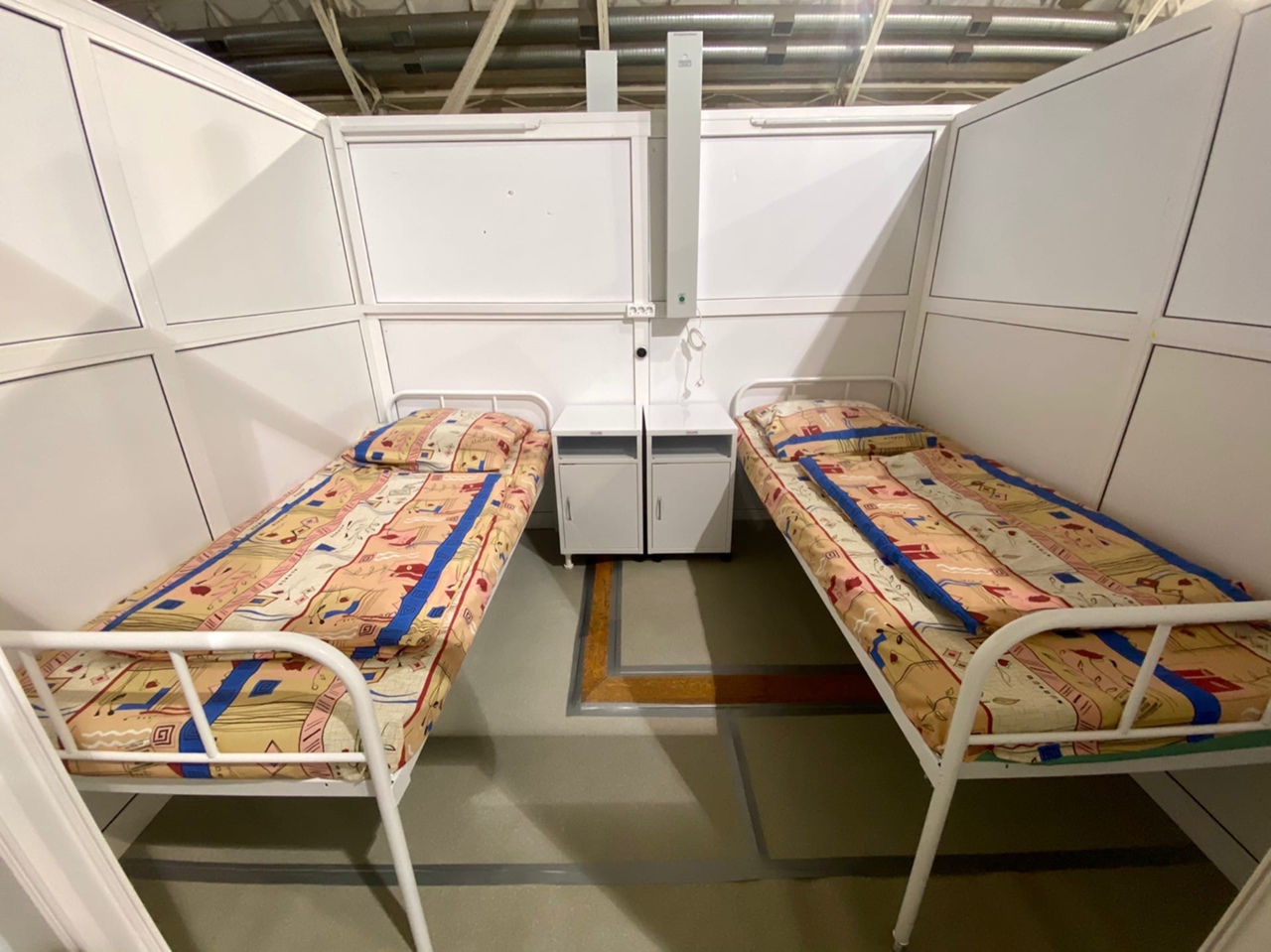 Ковидный госпиталь на базе манежа “Арсенал” полностью готов для размещения больных. Игровую площадку разделили на 4 сектора по 52 койки - по 2 на палату. Почти все оснащены обеззараживающими лампами, кнопками для вызова медсестры и мобильными кислородными концентраторами. Кроме того, в госпитале есть палата интенсивной терапии, где установлены уже инвазивные аппараты ИВЛ.