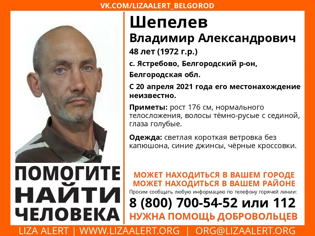 Шепелев Владимир Александрович пропал в селе Ястребово Белгородскиого района. С 20 апреля 2021 года его местонахождение неизвестно. Предположительно, он может находиться в Тульской области.