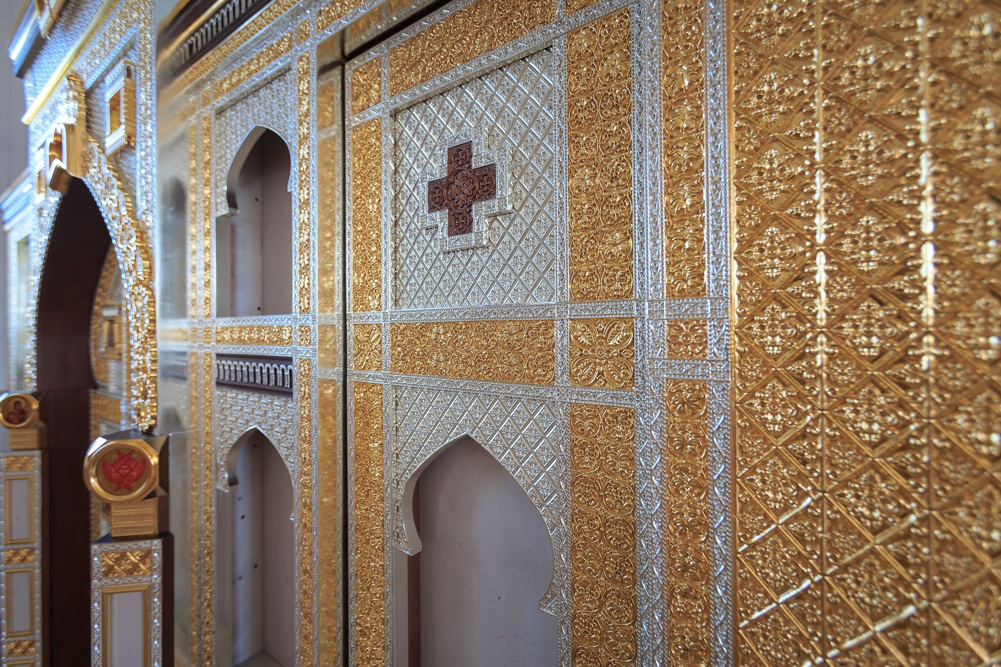 Несколько столетий назад мастера вырезали узор вручную. В наши дни элементы декора алтарной преграды и копии Царских врат специалисты изготовили на станках с программным управлением. Основную часть иконостаса выполнили из сосны, элементы декора - из бука. Твердые порода деревьев позволили избежать дефектов при резке орнаментов.