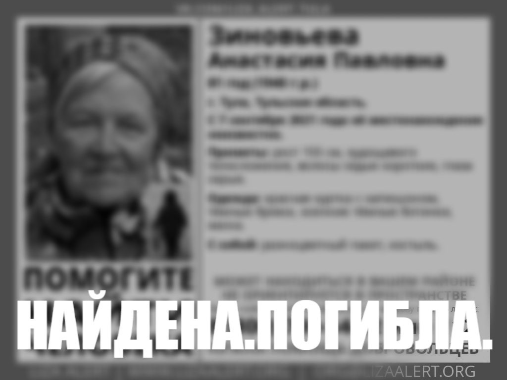 За последние дни поисковый отряд "ЛизаАлерт" завершил работу по розыску 81-летней Зиновьевой Анастасии Павловны, которую искали в Туле с 10 сентября, и 54-летнего Смирнова Александра Николаевича, который пропал 12 сентября в Узловой. Волонтеры выражают соболезнования близким погибших.