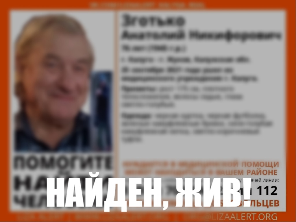 Также отряд "ЛизаАлерт" сообщает, что пропавший ранее из больницы пожилой мужчина найден живым.