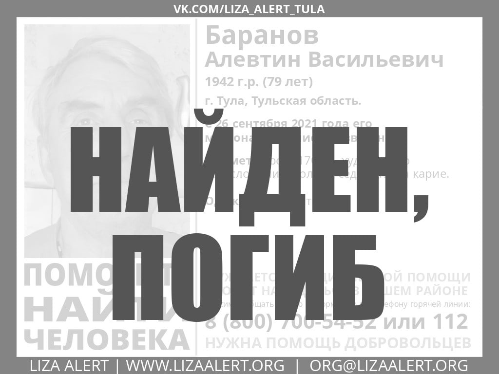 Напомним, сегодня утром "Первый Тульский" сообщал, что пожилой мужчина ушел из дома 26 сентября 2021 года. Долгое время его местонахождение было неизвестно. К сожалению, сейчас под ориентировкой появилась подпись, не оставляющая надежды.