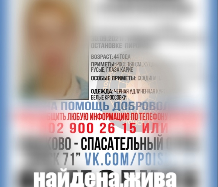 Пропавшая в Туле 44-летняя женщина найдена живой.
