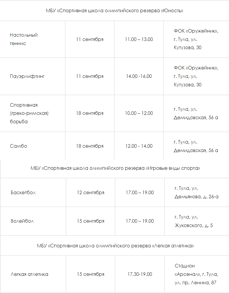 С 7 по 18 сентября спортивные школы Тулы проведут дни открытых дверей. Об этом сообщает управление физической культуры и спорта городской администрации.