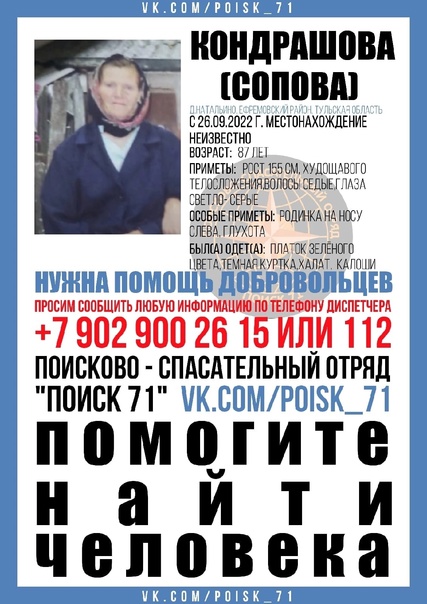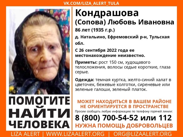 Кондрашова Любовь Ивановна, 87 лет. Проживает: д. Натальино Ефремовского района. О ее местонахождении ничего не известно с 26 сентября.