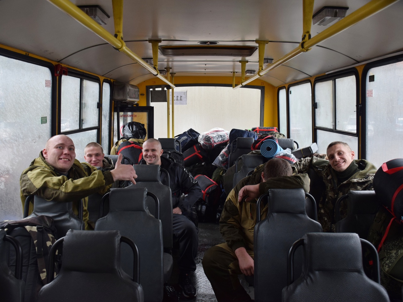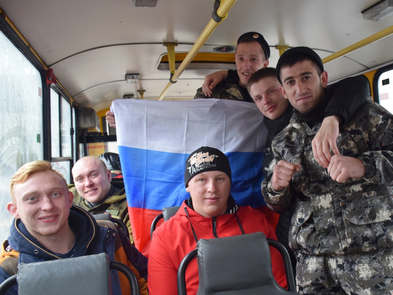 Мобилизованные мужчины отправились на боевое слаживание с улыбками. Некоторые взяли с собой флаги России.