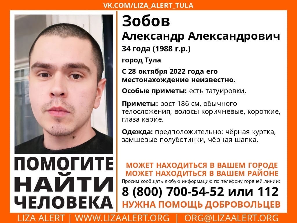 В Туле и области вторую неделю ищут 34-летнего молодого человека с татуировками. С 28 октября о нем ничего неизвестно, сообщает поисковый отряд «ЛизаАлерт».