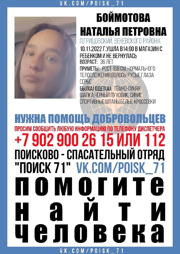 Боймотова Наталья Петровна ростом 158 см, нормального телосложения, волосы русые, глаза серые. В последний раз её видели в темно-синей шапке чёрном пуховике, синих спортивных штанах и белых кроссовках.