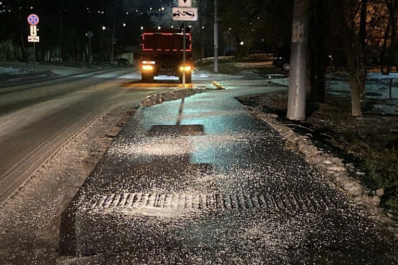 Днем на улицы города вышли 70 машин и 190 рабочих. Особое внимание уделяется посыпке подходов к остановкам и соц.учреждениям, а также обработке спусков, подъемов и парковочных карманов