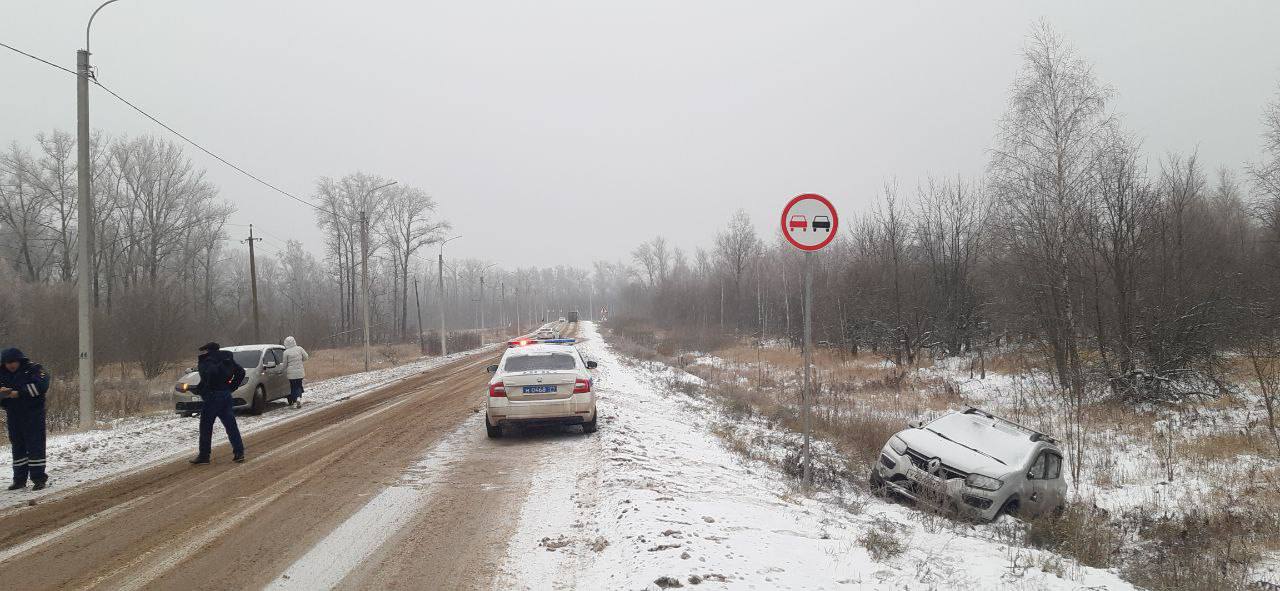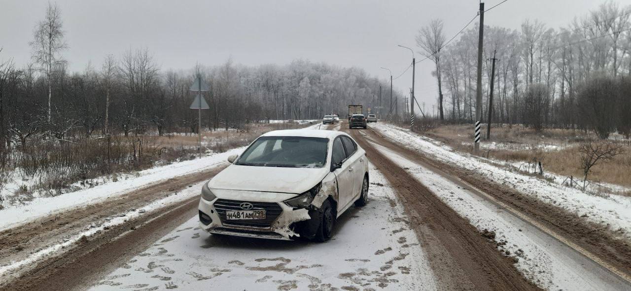На заснежено дороге столкнулись ехавшие в разных направлениях Hyundai и Renault, из-за чего Renault улетел в кювет.
