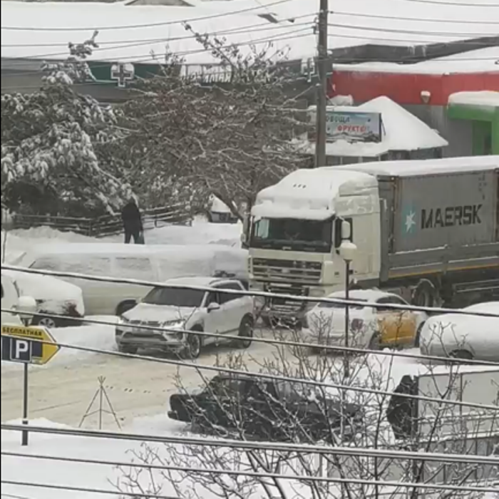 В Туле водитель Volkswagen Touareg вытащил буксующую фуру Maersk. Видеозапись произошедшего очевидцы выложили в соцсети.