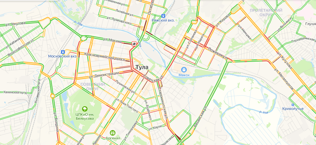 По данным онлайн-карт, пробки в оружейной столице оцениваются в 6 баллов. Некоторые улицы полностью или частично окрашены в красный цвет, среди них: Староникитская, Оборонная, Советская, Ложевая, Марата, Кирова, Карла Маркса, 9 Мая, Болдина, Станиславского и т.д.