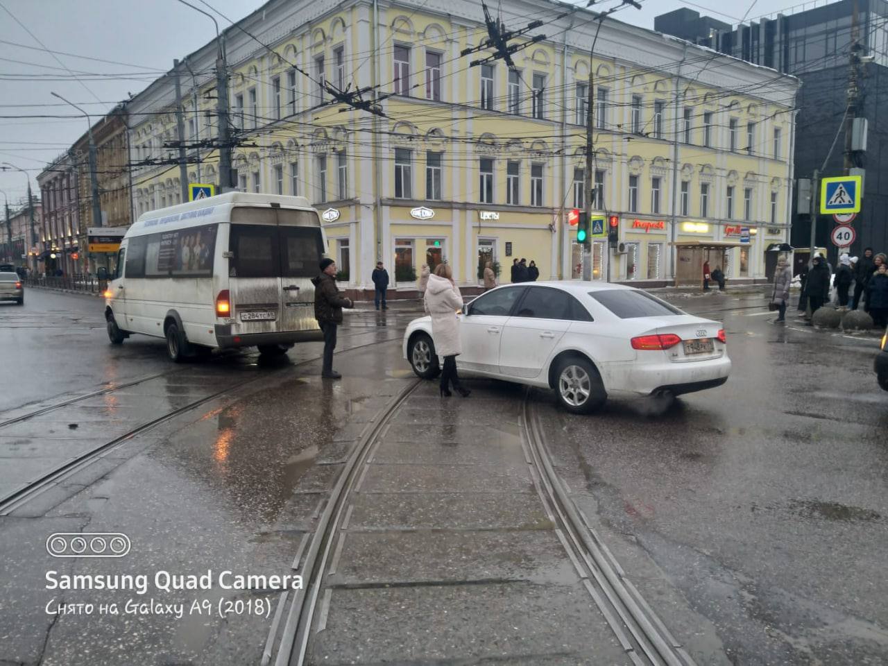 На трамвайных путях на повороте на ул. Ф. Энгельса столкнулись микроавтобус и Audi. Пострадавших, по словам свидетелей происшествия, нет.