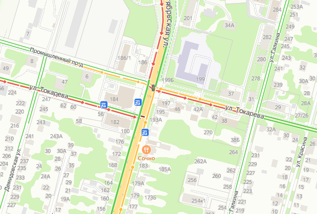 На онлайн-картах показано, что улица Токарева полностью окрашена в красный цвет, то есть движение по ней затруднено. При этом улица Октябрьская зеленая после пересечения с Промышленным проездом.