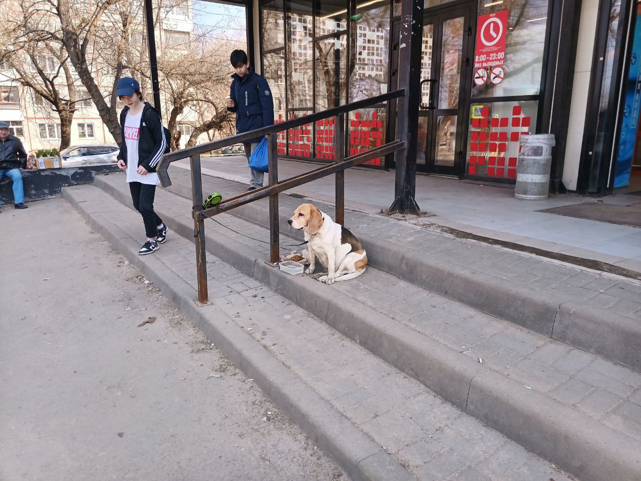 В Туле бросили или забыли возле магазина породистую беременную собаку.