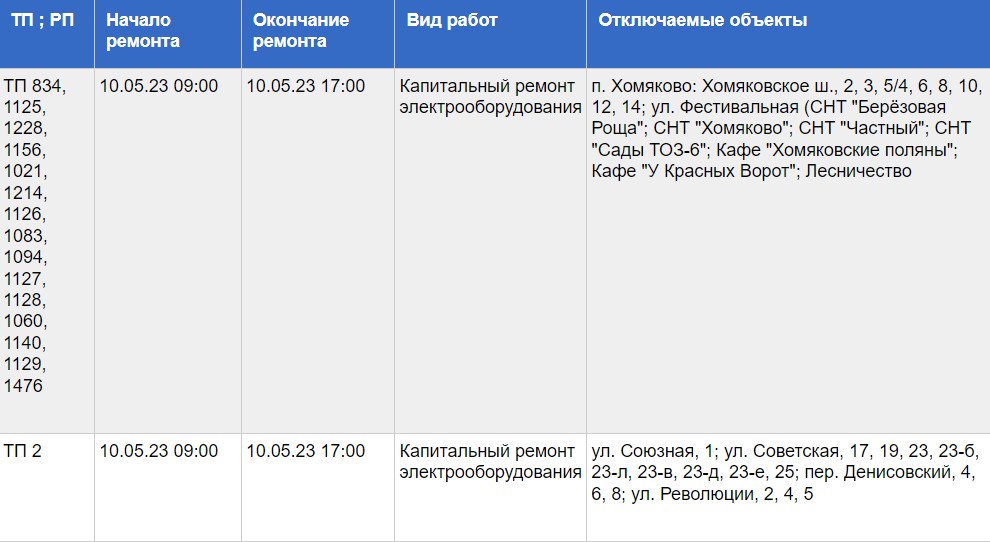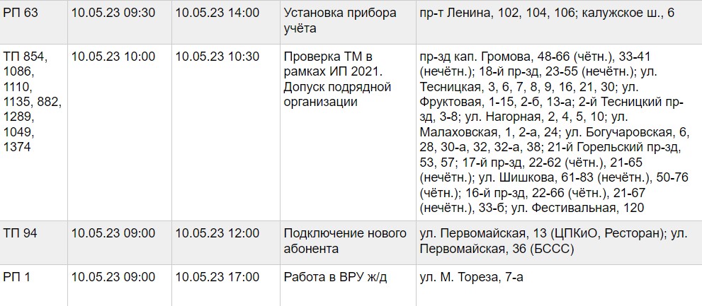 Публикуем список адресов, жители которых на время останутся без электроснабжения:
