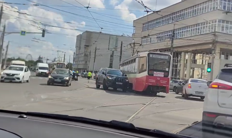 3 августа на пересечении улиц Оборонной и Советской произошло ДТП. Столкнулись внедорожник Toyota и трамвай. По предварительной информации, автомобиль выполнял поворот в момент происшествия. Как видно на кадрах, удар пришелся по касательной.